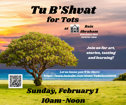 February 1 @ 10:00 am - 12:00 pm Bais Abe Young Family Tu B’Shvat Celebration Bais Abraham Congregation 6910 Delmar Bivd, St. Louis, United States Holidays Join us with your youngest family members for a morning of singing, learning, creating and tasting for Tu B'Shvat!